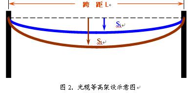 當光纜的氣象條件確定后,可以按照客戶要求的跨距和芯數進行設計了.ADSS光纜有等高和不等高架設兩種方式,圖2為等高架設時光纜的懸掛情況.